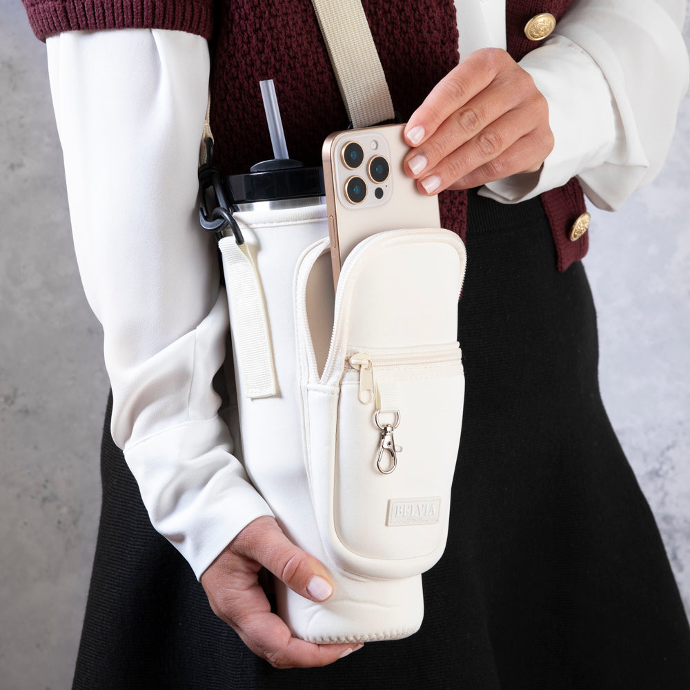 Travel Mug - Water Bottle Carrier Bag With Phone Pocket - Cream