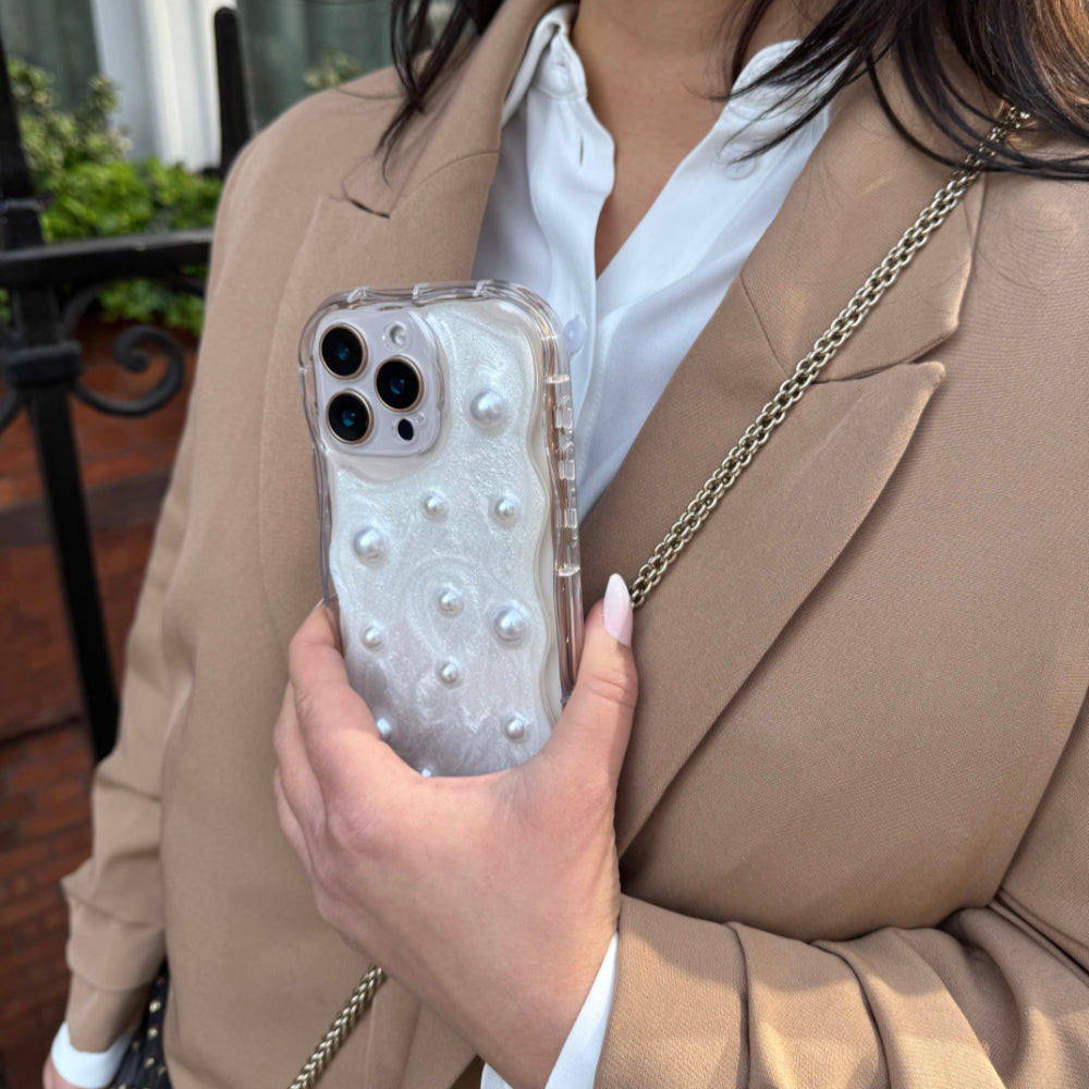 Timeless, elegant, and effortlessly luxe – the Luxe Pearl iPhone 15 Case is the definition of understated glamour. Featuring moulded electroplated silver pearls, set against a shimmering taffeta-inspired background, this case is made for those who love a touch of opulence. The light-reflecting details add a soft, radiant glow, turning your phone into the ultimate accessory.
